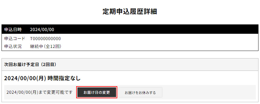 定期申込履歴詳細の次回のお届け予定欄にて「お届け日の変更」ができます。