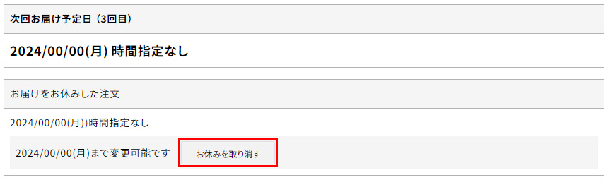 お届け日をお休みすると、次回のお届け予定日とお届けをお休みにした注文が表示されます。