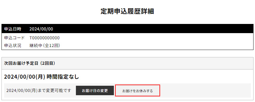 定期申込履歴詳細の次回のお届け予定欄にて「お届け日をお休みする」ができます。