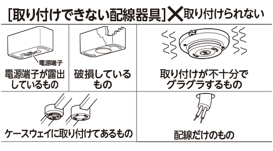 取り付ける電源(壁スイッチなど)に調光機能がないことをご確認ください(調光機能が付いていると使用できません)。