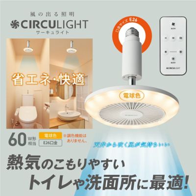 洗面所の電球をサーキュライトに替えました。 暑がりの私は年中、洗面所には扇風機を置いてお風呂上りに使用していました。 サーキュライトに替えたところ風量もあり涼しくてとても快適になりました。 また扇風機を置かなくてよくなりスペースもできスッキリしました。 明るさも通常の明るさと照度大の二段階に調整ができるのでとても便利です。 今後はトイレも電球も替えようかと思っています。